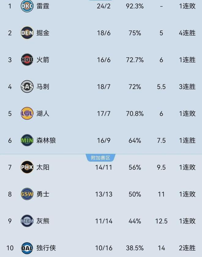 湖人本赛季至今,以17胜7负排名西部第五,只落后第二的掘金1个胜场。